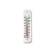 Plastic wall thermometer with clear, black printed scale on white moulding.