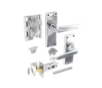 Contents: 1 Set of Latch Handles, 1 x 64mm Mortice Latch & 1 Pair of 76mm Chrome Plated Hinges