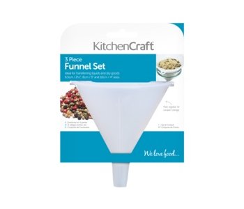 Useful for a multitude of bottling and pouring uses, this Kitchen Craft set of three assorted sized funnels is made from a highly durable food safe plastic. The set includes a mini, medium, and large sized funnel, that all nest inside one another for easy storage.