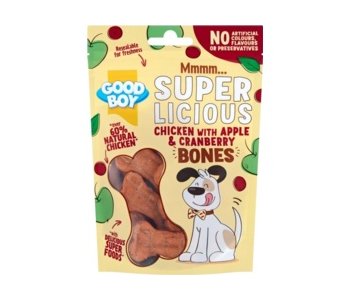 Made with over 60% real chicken and blended with delicious superfoods that are recognised by pet parents across the country (!) these Chicken with Apple & Cranberry Bones are sure to get your dogâs tail wagging.